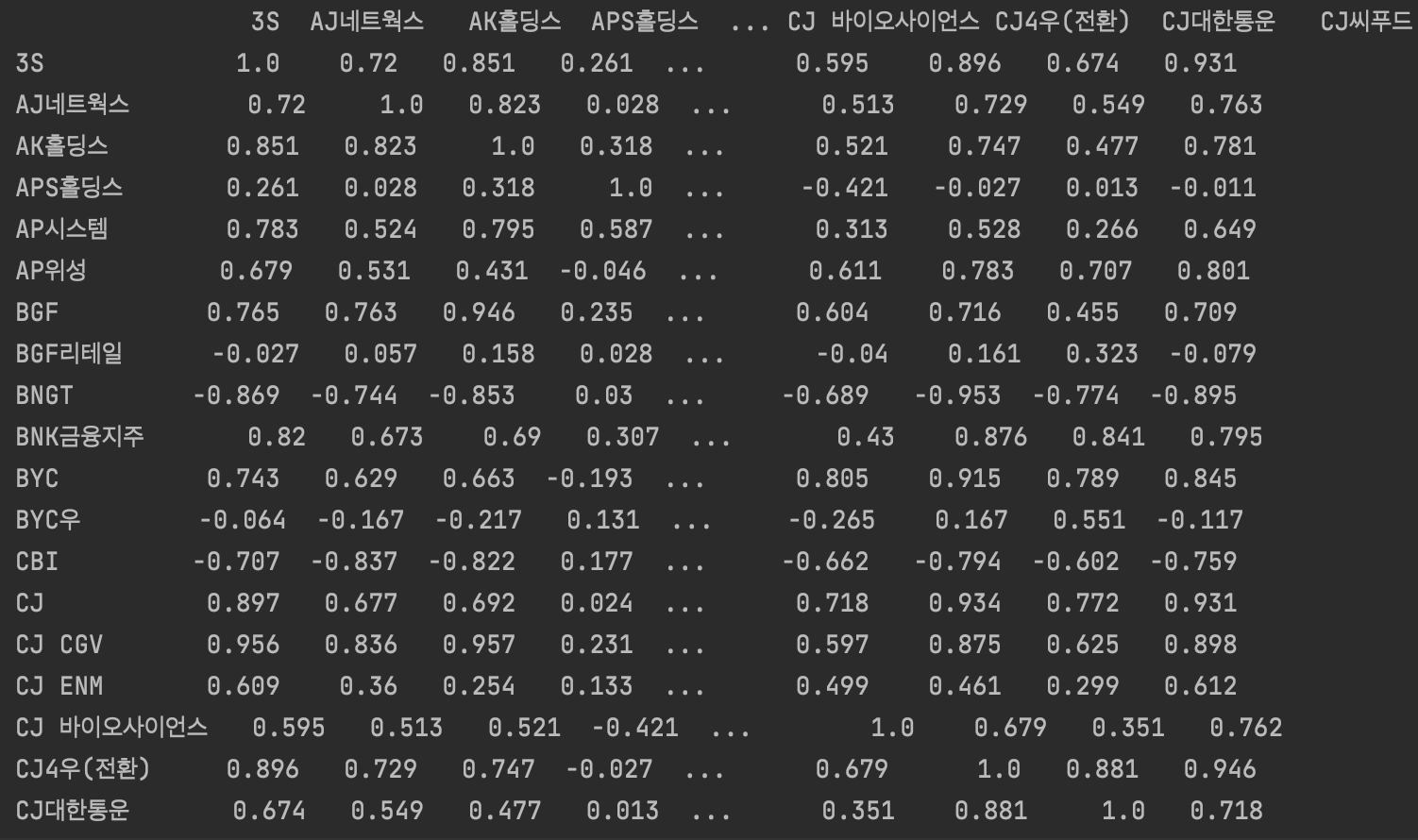 결과로 종목명이 인덱스와 컬럼인 df을 만들어짐