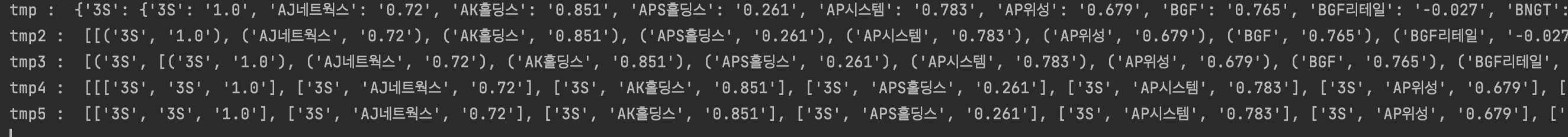 근데 그 리스트의 형태를 [[인덱스명,컬럼명,상관계수],[인덱스명,컬럼명,상관계수],[인덱스명,컬럼명,상관계수]....] 형태로